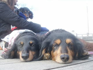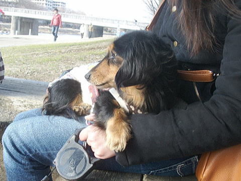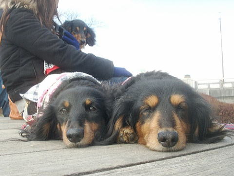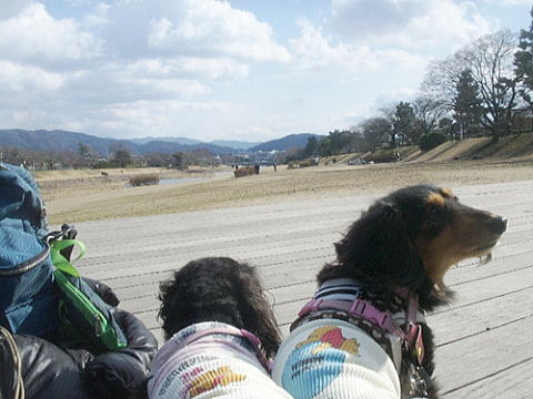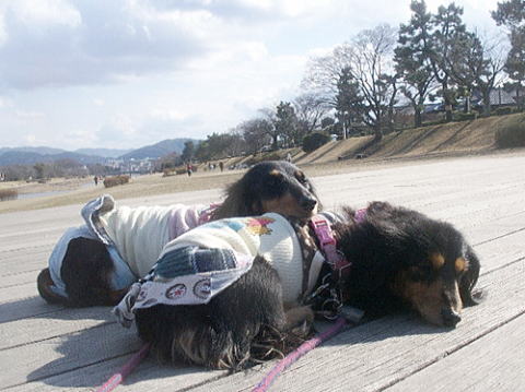 寒いような暖かいようなよくわからないお天気だったけど、出雲路橋まで着いて、ポカポカとした日差しのもと、広々としたデッキの上でお昼寝して休むおまえたちはとっても気持ち良さそうだったね。