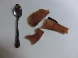 くろとのこのウマウマこめんと♪ ・・・サメの身って、アレルギーを引き起こしにくいおさかななんだよ。だいたい、サメはふだんでもそんな食べることってないからほとんど心配ないと思うよ。 ちょっぴりかまぼこにも似たわたしたちの大好きなにおい♪おやつ袋のチャックが開くとついついおねだりしちゃいます☆ 店主からのコメント ・・・栄養的にはメインの栄養素というとたんぱく質なのですが、魚体が大きく畜肉に似たたんぱく質がメインと言うとやはりサメがいちばん近いように思います(大型魚にはまぐろなどもいますが、まぐろの身はどちらかというと栄養的にミネラル分を多く含んでいるため馬肉や鹿肉などの精肉やレバーなどの内臓系に近いように思います)。また脂肪分が少なくヘルシーな肉質でアレルギーが出にくいので、特に何らかのアレルギーを持つ子やダイエット中の子、消化も良いのでもちろん仔犬から高齢の子まで幅広く食べることができます。 |