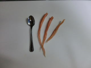 くろとのこのウマウマこめんと♪ ・・・定番のおやつだよね。くろとのこも大好きです♪でもお日さまの照りぐあいや気温で仕上がりががらり!と変わってくるなかなかむずかしいおやつなんですぅぅぅ。食べやすいおやつなのでちっちゃい子から大きな子までみんなで食べられるよ。 店主からのコメント ・・・ひとつの部分で太い部分と細い部分があるので、干すのにわりと手間がかかるおやつです。干し時間が一時間変わるとほんと!!仕上がりががらりと変わるほどです。 スタンダードなおやつなだけに、全ステージで食べることができます。 ただ、栄養的には鶏もも肉などに比べてヘルシーではありますが、栄養素に富んだおやつではなく、ささみだけを与えていると偏りがちになってしまいますので、ほかのおやつと織り交ぜてまんべんなく与えるようにしてください。 |