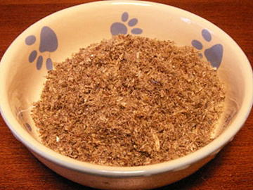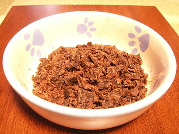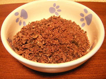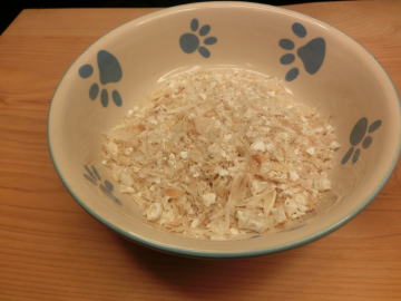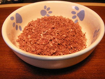 デザートスプーン(大きめのスプーン)に一杯ないしは二杯をドッグフード(一食分)にふりかけ、スプーンまたは手でまんべんなく“ドッグフード全体にまぶす”ような感じに混ぜてお与えください。